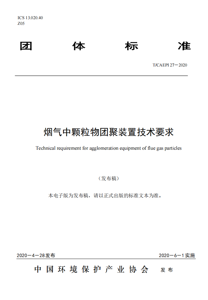 烟气中颗粒物团聚装置技术要求(T/CAEPI 27-2020)