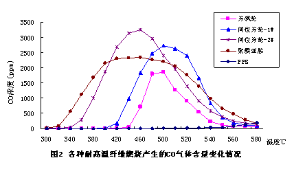 另外不同纤维CO分解的起始温度也不相同,最先分解的为聚酰亚胺和间位芳纶-2#纤维,约在330℃;间位芳纶-1#和芳砜纶纤维分解温度出现在440℃左右;PPS纤维则在550℃高温后才开始产生CO。