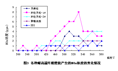 间位芳纶-2#纤维燃烧产生NOx气体的起始分解温度较其他纤维低,约在400℃,其他依次是PPS纤维、间位芳纶-1#纤维、芳砜纶纤维和聚酰亚胺纤维;