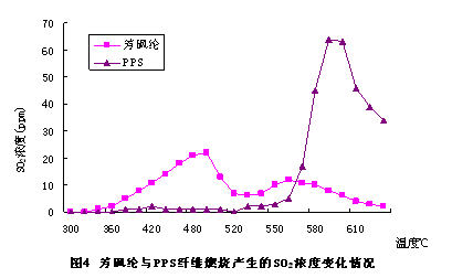 试验的五种纤维样品中,如表2中所列的各种纤维的化学分子结构式,由于芳砜纶和PPS纤维的分子主链上分别还有砜基和苯硫基,因此这两种纤维燃烧气体中还有SO2气体。图4为燃烧测试的芳砜纶与PPS纤维样品燃烧产生的SO2浓度的变化情况。由曲线变化情况可明显得,芳砜纶纤维在500℃时,燃烧产生的SO2气体浓度达到最大值,为22ppm;而PPS在接近550℃时,SO2的含量才明显上升,在600℃高温时达到最大值,为64ppm。