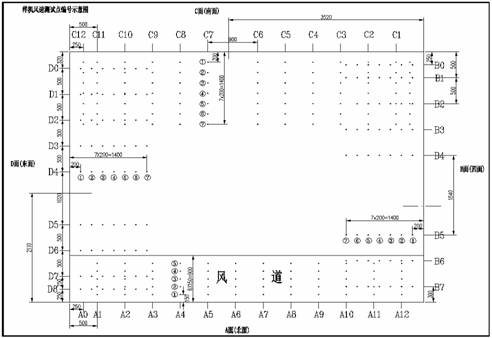 为了较为准确的确定现有除尘器内的流场分布情况,笔者对除尘器滤袋下部中箱体内同一水平面进行了风速测试,测试设备采用风速仪(量程:0~20m/s),测点分布如下图(见图3):