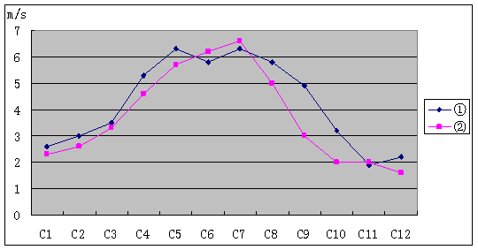 上图中风道即为进风通道,进风通道内的风速分布比较均匀,进风通道对侧(C面)测得的风速分布如下(见图4):