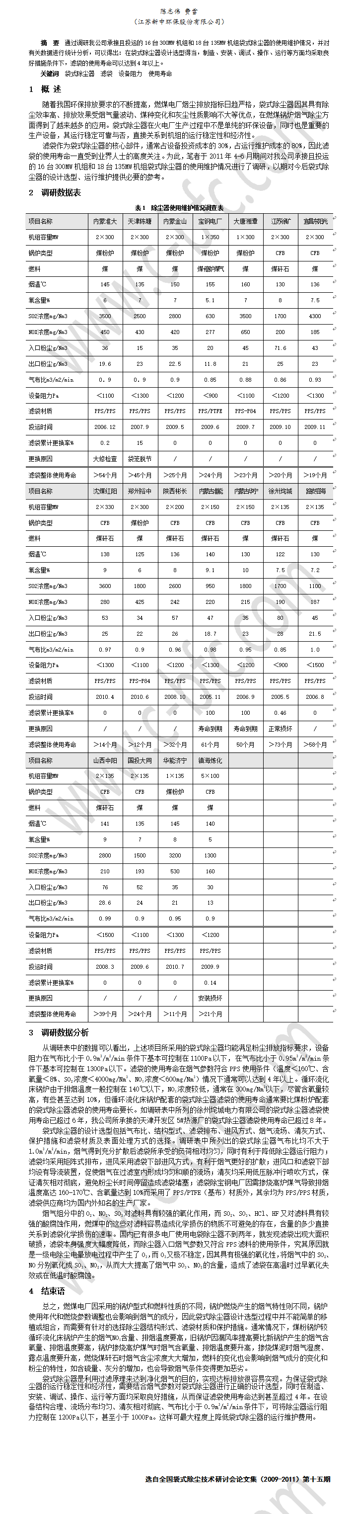 燃煤电厂袋式除尘器滤袋使用情况调研与寿命分析