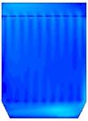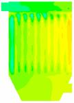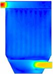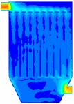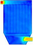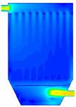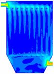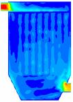 如图16所示,加了导流板之后燃煤烟气在除尘器内的速度场也得到了很大的改善。也是在下箱体靠近烟气进口处有一个高风速区域,但是被导流板阻挡,不会对滤袋底部形成强烈的冲刷,从速度矢量图17可以看出整个除尘器内也只有一个由于这个高风速区域造成的一个大的涡流,但由于涡流几乎在整个除尘器内形成,所以整个除尘器内的速度场还是比较均匀的。
